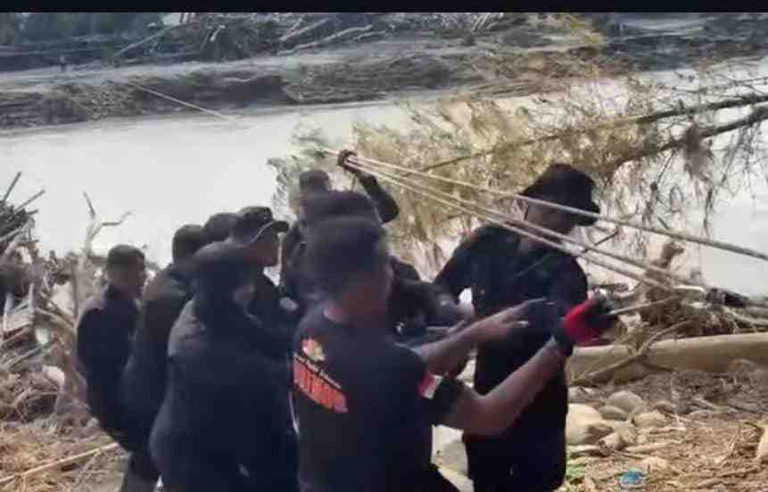 Di tengah lumpur dan sisa genangan air, anggota Brimob Aceh bahu-membahu bersama warga membangun jembatan sling sederhana.