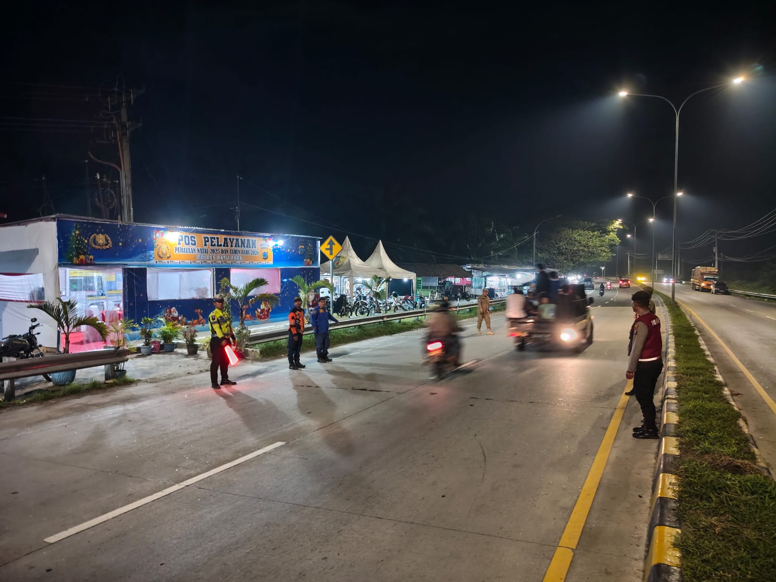 Pada Kamis, 01 Januari 2026, personel Pos Pelayanan (Pos Yan) II Pintu Tol Limapuluh melaksanakan kegiatan pengaturan lalu lintas (gatur) malam dan memberikan laporan langsung (live report) mengenai situasi terkini.